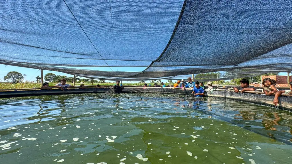 A comunidade indígena Avá Guarani da aldeia Aty Mirĩ, em Itaipulândia, realizou na última quarta-feira (28) uma atividade de manejo sustentável da piscicultura comunitária, com a despesca parcial de peixes criados em tanques elevados instalados no próprio território.