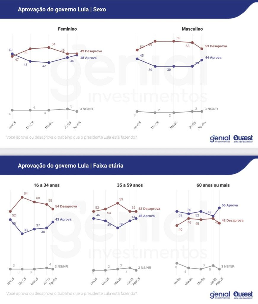 Quase todos os recortes da pesquisa mostram melhora. Entre as mulheres, a aprovação oscilou positivamente dois pontos percentuais, chegou a 48% e encostou na desaprovação, de 49%.