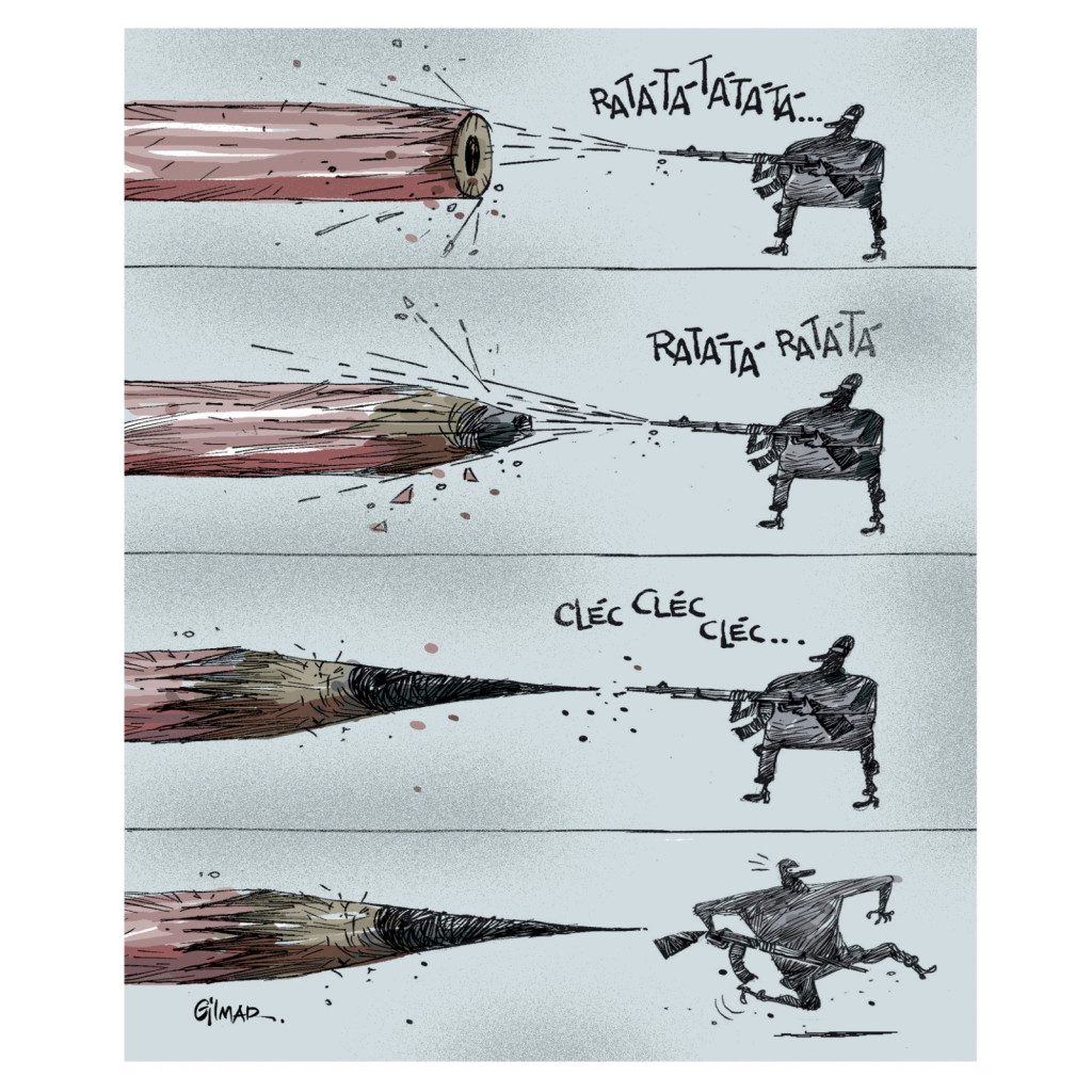 A charge mostra um lápis gigante que se afia sozinho e enfrenta o terrorista, transformando a violência em uma metáfora de resistência e educação. Essa obra participou de um festival em Oslo, Noruega, recebendo premiação e reconhecimento internacional.