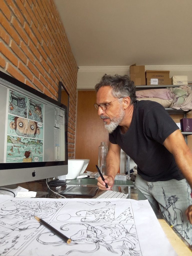 Eu tenho muita vontade de sair do papel. É uma vida inteira dentro de 21cm por 30cm. Aquele papel sulfite ali. E eu tenho muita ânsia, muita vontade de extrapolar aquele aquele espaço físico limitadíssimo. Tenho até feito experimentações com lambe nas ruas e teve um impacto muito legal, muito importante. Isso me estimula depois de muitos anos no papel de prancheta